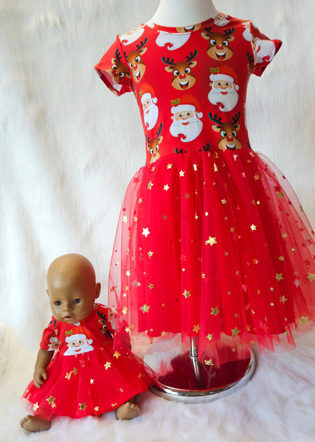 Made from premium digital print knit fabric, with 2 layers of tulle, a knit fabric skirt and bodice with short sleeves.